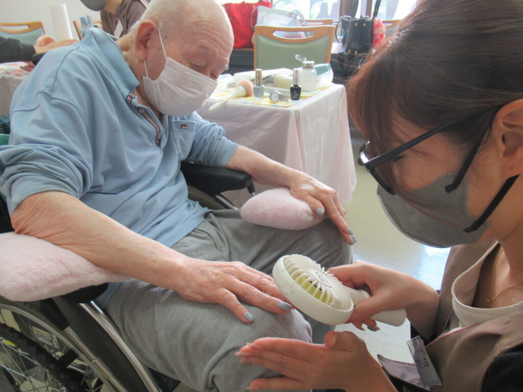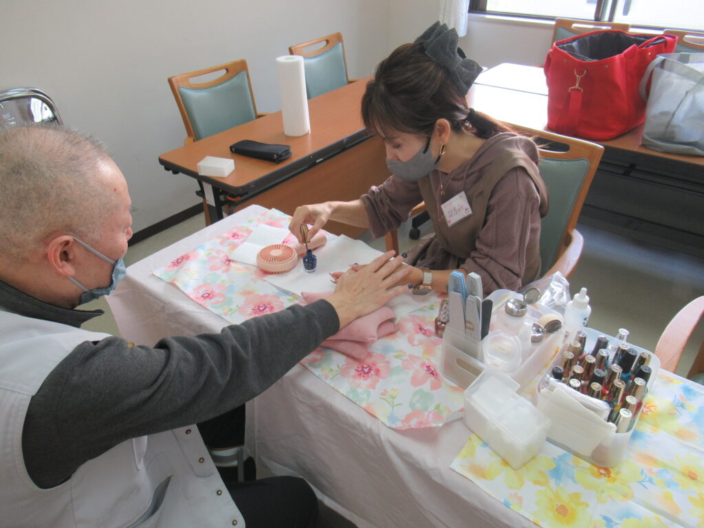 代表の望月様とスタッフの方が訪問され、入居者様に素敵なネイルケアをしていただいています☆